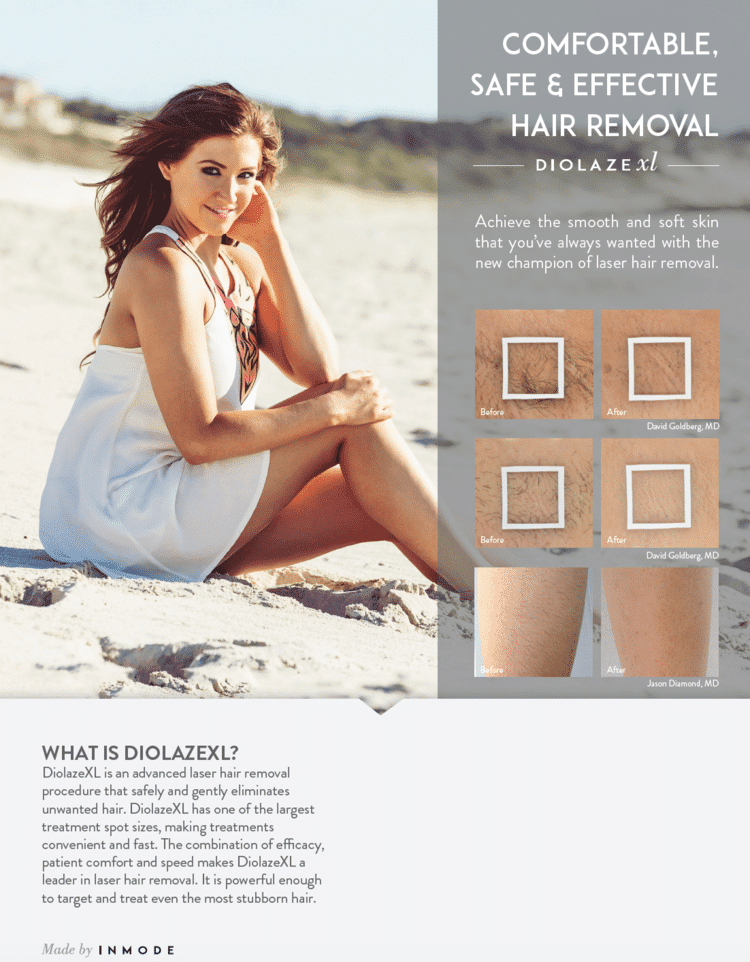 Say goodbye to razors, waxing, and ingrown hairs. DiolazeXL is an advanced laser hair removal system that safely targets hair at the root, preventing future growth and leaving skin smooth and soft.